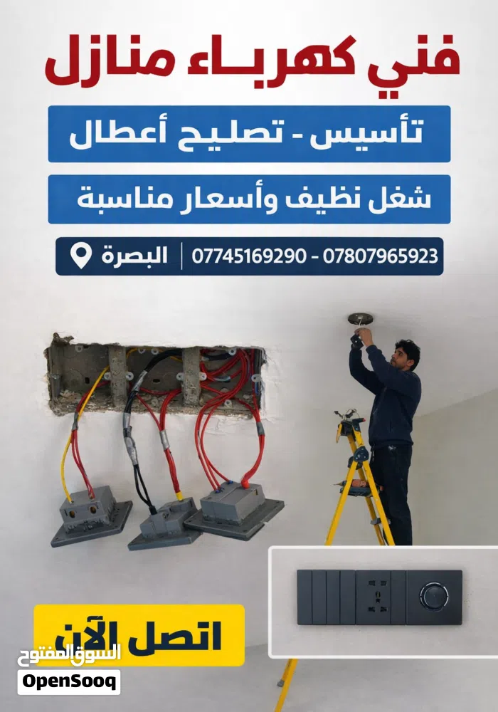فني كهرباء منازل – البصرة الخدمات: تأسيس الكهرباء في المنازل تصليح جميع الأعطال الكهربائية تركيب مف